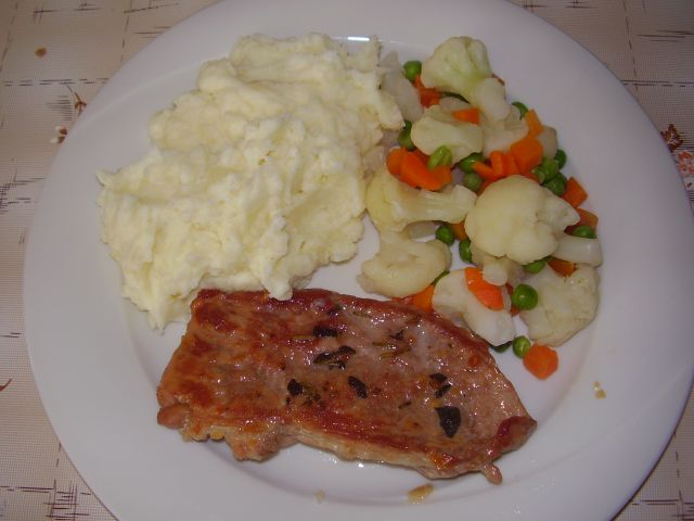 Pire krompir, svinjski zrezek z mediteranskimi začimbami, malo zelenjave in solata.