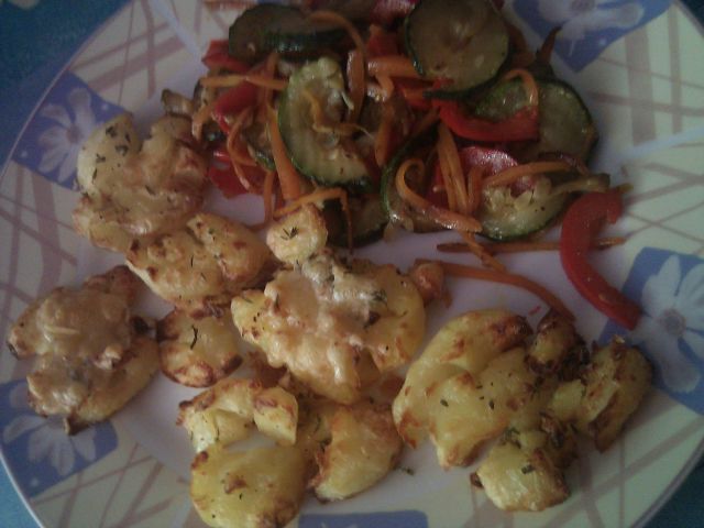 Mene pa je ta krompirček zamikal že danes...se ravno peče. Zraven pečena zelenjava, pa solata.