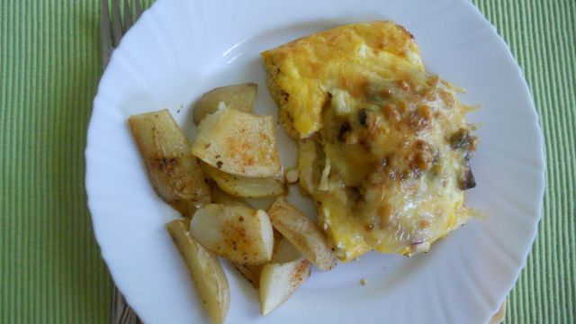 VijavajaJajčna omleta s porom in dimljenim sirom, ržen kruh, paradižnikova solata s čebulo.