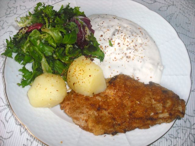 danes pa piščančji zrezki v kari omaki s kaprami, rizi-bizi, zelje v solati.