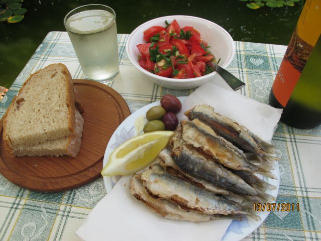 Ko je vse padlo v vodo, kaj pa čem, spražim ribe, kajla kruha in flaša vina ( a sem pravil tisto o dobrem kosilu in mački, a da nisem, bom mogel enkrat ob priliki povedat ). Torej: