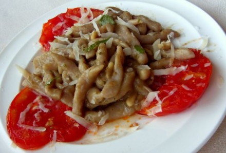 , zato danes domače polnozrnate testenine (brez jajc) s prelivom iz jajčevcev, malo sveže mete (z malim m) in popečeni paradižniki: