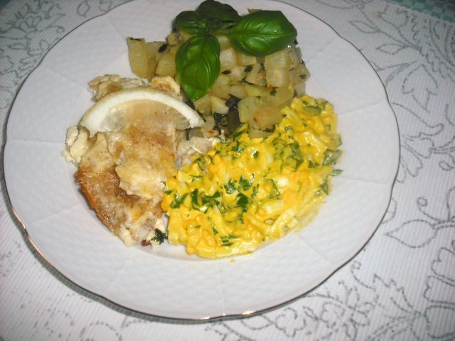 Danes: popecena riba (prevod iz gugla "trsk") nadzemeljska kolerabica, besamelova omakca z dodatkom petersilja in v trdo kuhanih jajc.![]()