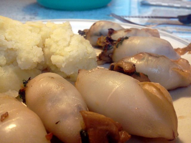 tjasZelenjavna juha, lignji polnjeni z gobicami in pire, kumarčna solata.