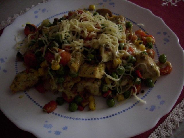 Danes: popraženo piščančje meso z masleno zelenjavo in sirom. Za sladico pa sadna torta s smetano.
