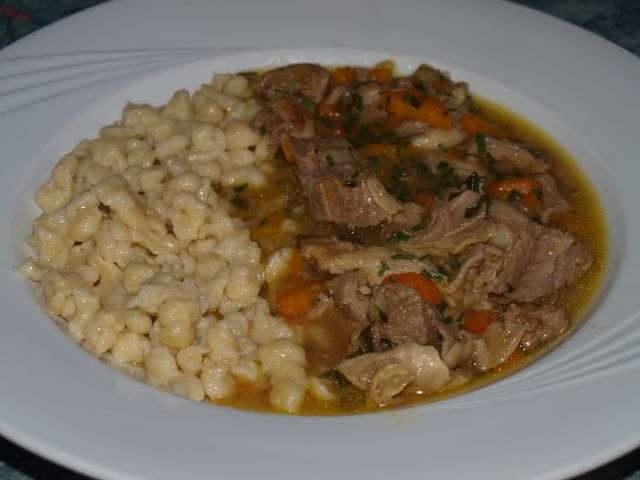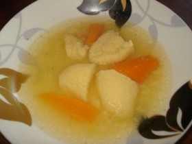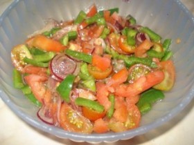 Goveja juha s zdrobovimi knedlci, ((dušen riž, govedina z juhe)-pozabila slikat) in paradižnikova solata s papriko.