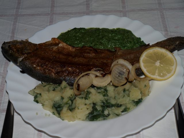 Krompir s špinačo, špinača, postrv, zelena solata: