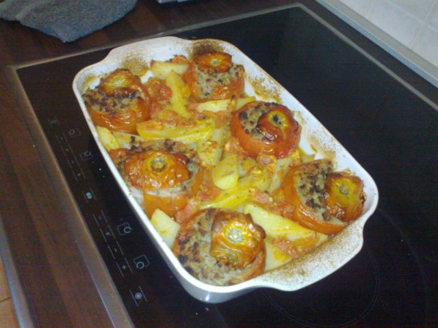 Vceraj polnjeni paradizniki po grsko...danes porova minestra s krompirjem in krhka pita z malinami in vanilijevo kremo