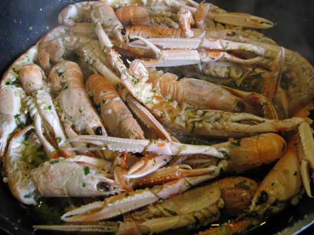 Danes: škampi v beli buzari, popečen kruh in kumarice v solati.