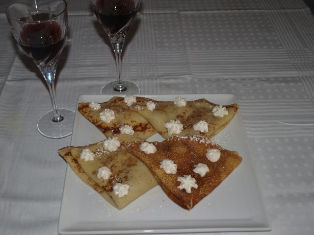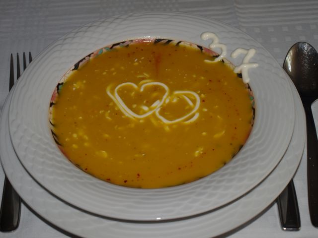 Bučna juhica; pijane perutničke s šampinjoni, korenčkom in krompirjem; zelena solata; palačinke, kozarec črnega v dvoje: