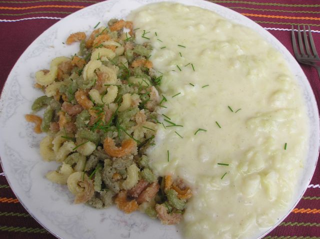 Danes kuhanje za eno osebo: tople kumare s krompirjem, makaroni z drobtinami