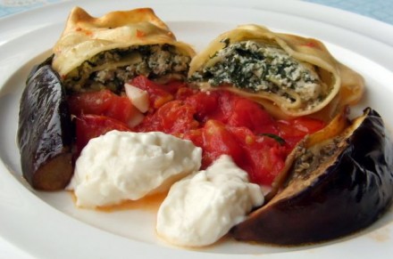 : kaneloni z blitvo in ricotto, pečeni na svežem paradižniku, s kosi jajčevcev, na koncu še malo svežega sira (stracchino)