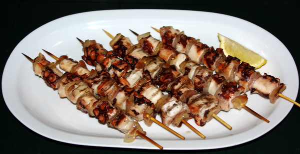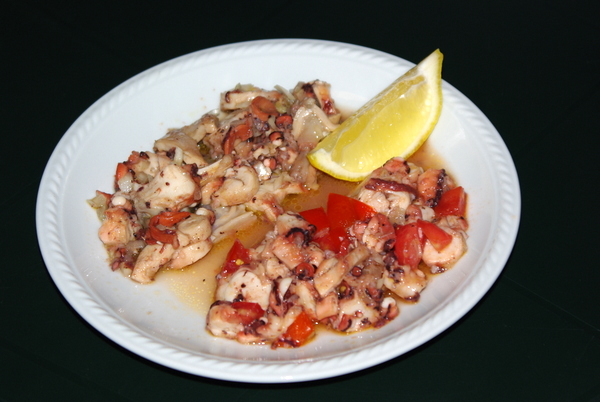 zgodnja večerja: hobotnica v solati (ena samo s čebulo, druga s paradižnikom), nabodalca s hobotnico in slanino