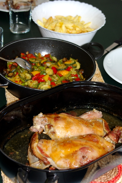 Danes smo imeli skupinsko kuhanje - glavni kuharici sva bili mami in jaz, asistenta mož in bratova punca: pečen piščanec in kozliček, pražen krompir zelenjava (cvetača, bučke in čebula) v pivskem testu s tatarsko omako, popečene bučke, radič z zeljem in paradižnikova solata.