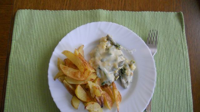 polarbearDanes: gratinirani šparglji z ementalerjem, pečen krompir, solata.