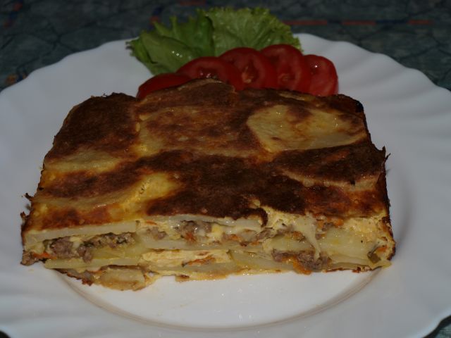 Krompirjeva musaka, zelena solata s paradižnikom: