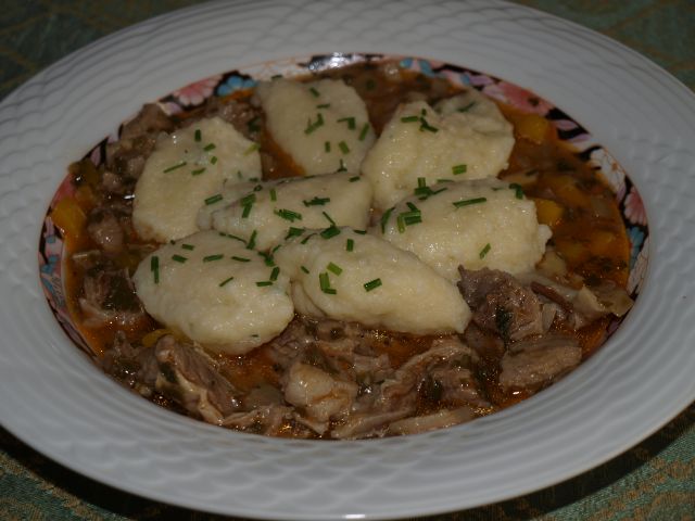 Telečji ragu s cmoki (smetana/zdrob); zelena solata: