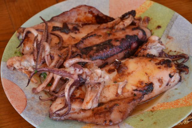 Danes je bil pa popravni: dagnje na buzaru in tisti veliki rdečkasti lignji na žaru;