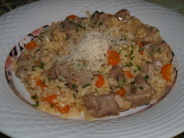 Danes je tudi pri nas bila tema riž, kar že dolgo ne: rižota, ki je izgledala podobno kot dragičkina, le da je namesto rdeče paprike bil grah in korenček, rdeča pesa. Posladek pa .................., ni ga bilo.