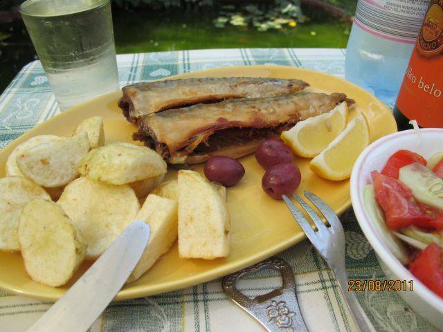 tjasVčeraj za malčka goveja juha z rezanci, golaž in polenta, za nas sataraš, čevapčiči in zelena solata, pa domači češnjevi paradižniki, čebula, paprika