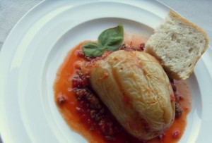 Danes pečene polnjene paprike (jajčevec, kruh, paradižnik, česen, ščep mesa, kapre, začimbe)