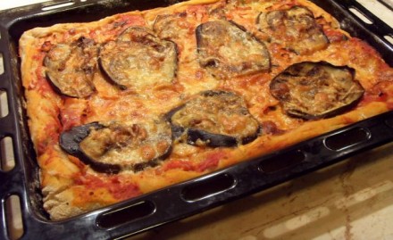 Na kratko: zelo dobro ugneteno testo (600g moke, 480g vode, 3/4 suhega kvasa, sol, 2 žlici olja) dam za 24 ur v hladilnik, nato ga raztegnjenega premažem z domačo salso (paradižnik, veliko česna in bazilike), bogato obložim s svežim sirom (stracchino), prej popečenimi jajčevci, posujem z grano, še malo poškropim s salso in spečem.