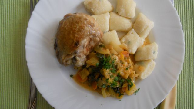 mzmTelečji zrezki v zelenjavni omaki, pire krompir, solata in slivova pita za sladico