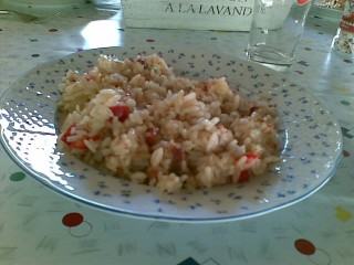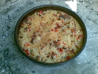 Danes smo imeli rižoto izpod peke. Ideja, ki se je v prvem trenutku zazdela kot en trapast domislek, ki je zrasel na zeljniku ta starejšega, se je kasneje, v tepsiji in še kasneje, na krožniku, izkazala za zelo domiselno in predvsem vredno vilic in želodca. Bodo ponovitve. Na sliki izgleda sicer suha, ampak je to samo na vrhu, kjer je nastala slastna skorjica, ko smo jo premešali, so se okusi razporedili, mmmm.... Aha, pol so sledili še sirov in bučni in češpljev štrudelj (sem naredila malo preveč vlečenega testa, no, pa kaj, glavno, da sem imela surovine za nadeve