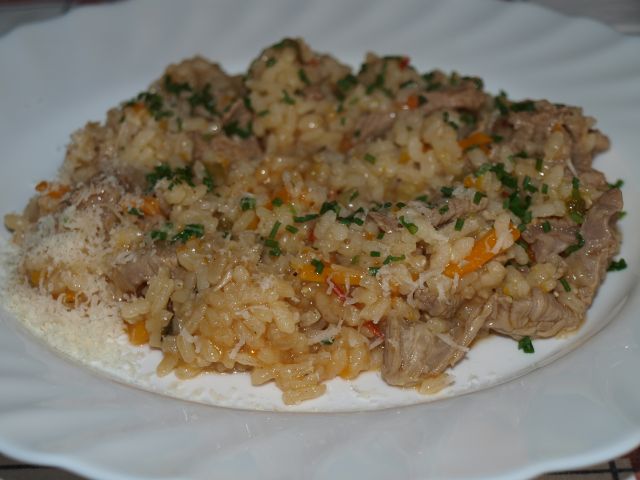 Telečja rižota, mešana solata: