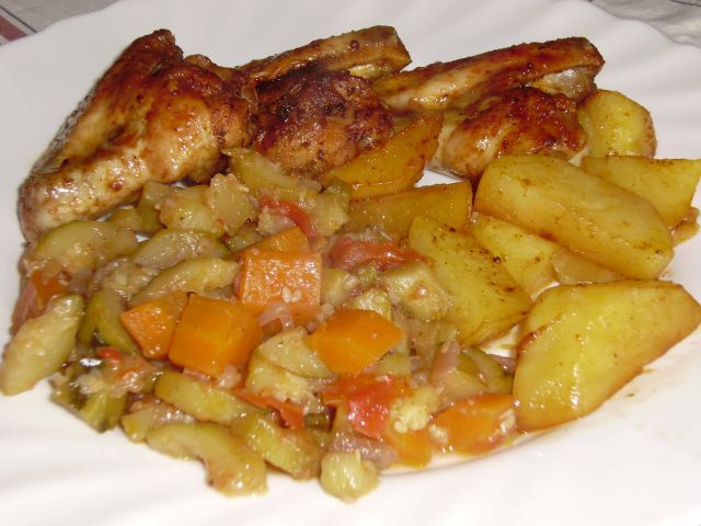Pečene perutničke s krompirjem, korenček in bučka v omaki, zelena solata: