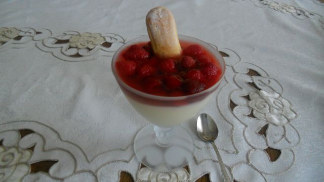 , mešana solata, vanilijev puding z malinami