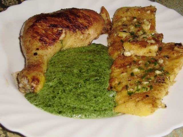 Pečeno piščančje bedro, blitva "a la špinača", popečena polenta - premazana s česnom, olivnim oljem, parmezanom /od včeraj/, zelena solata: