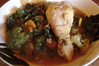 tanjajZelenjavna enolončnica (korenje, por, listnati ohrovt in brokoli) s piščančjim mesom.