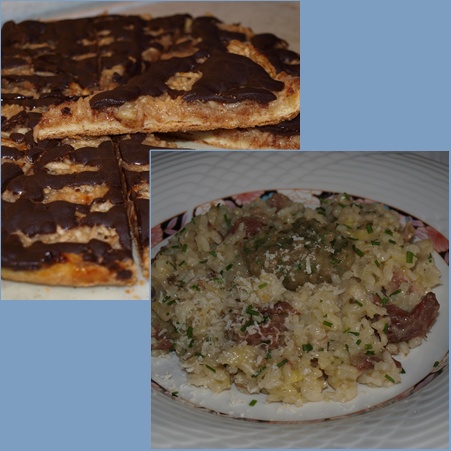 Juhica iz govejega repa, rižota (por, oglodan goveji rep, revežev kaviar), zelena solata, jabolčna pita (iz ostankov):