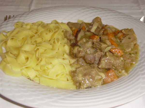 Široki rezanci in telečji ragu z gobanom, zelena solata: