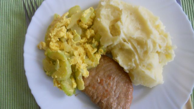 mzmDanes: svinjski zrezki, krompirjev pire, bučke z jajci, mešana soalta, panna cotta z jabolčnim prelivom