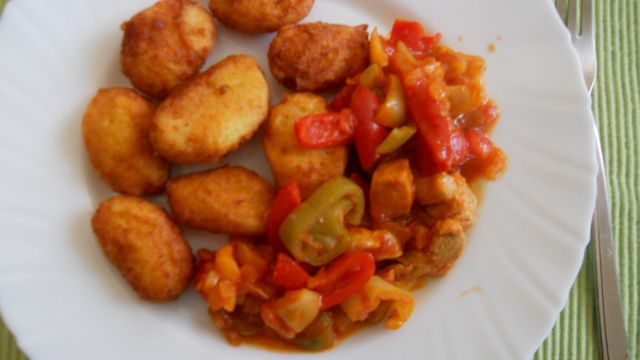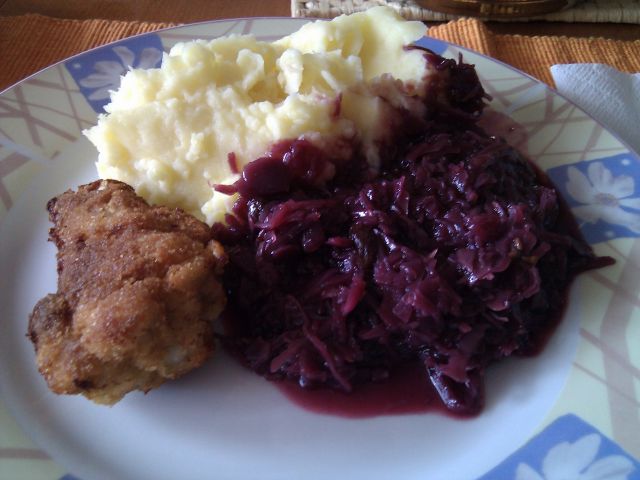 Pire krompir, rdeče zelje, ocvrt piščanček...pa nekaj sladkega.