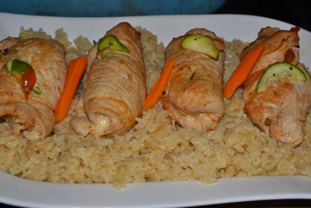 Včeraj smo jedlo govejo juho z ribano kašo, puranje roladice (pršut, sir, sesekljane olive) na rižu