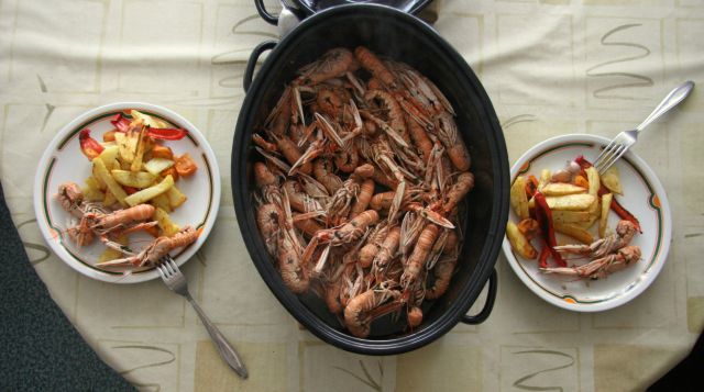 Danes škampi na buzaro (skuhano zunaj na balkonu, da nisva odišavila celega bloka), krompir iz pečice in solata