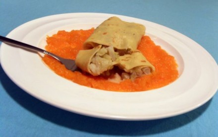Danes smo spet tolkli "pirin ričet", brez mesa in palačinke, polnjene s cvetačo, porom in ohrovtom