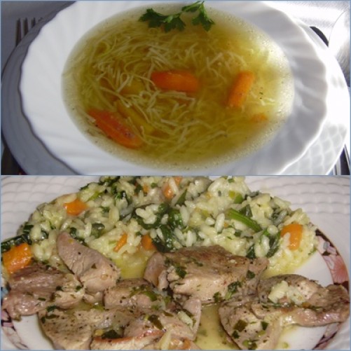 Kostna juhica z domačimi rezanci, zelenjavni rižoto (por, korenček, špinača, parmezan, vino), puranji koščki v vinsko-česnovi omaki, zelena solata:
