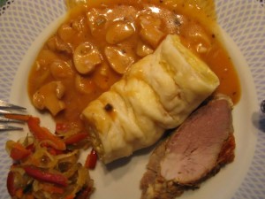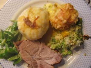 Nedelja; Goveja juha z rezanci, mrežna pečenka, gratinirana cvetača in brokoli,krompirjevi cmoki, motovilec s fižolom;Ponedeljek;Ostanki pečenke, gobova omaka, skutini štruklji(domači).