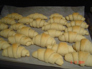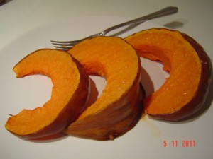 Pečene muškatne bučke s sladkorjem, rogljički iz bele gladke moke, ajdova zlevanka. Danes raca in mlinci.