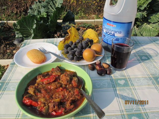 - nekaj malega krompirjeve solate (mimgrede, a ste videli, koliko krompirja ostaja na njivah, ga nekateri kar podorjejo, hvalabogu da so tistih 40 ton prostovoljci pobrali in dali na Karitas????!!!!!!!)