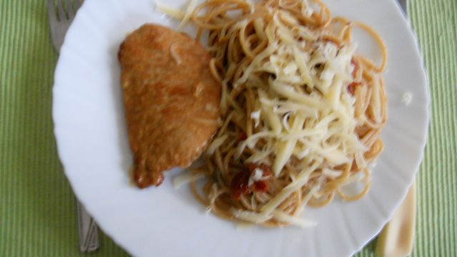 Danes: svinjski zrezki, špageti z omako iz posušenih paradižnikov, zelena solata