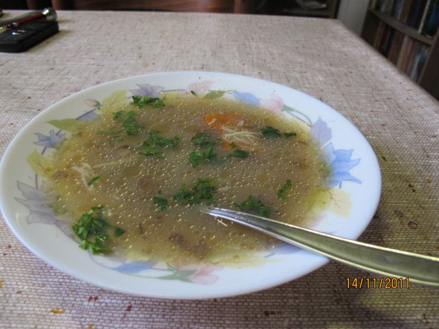 Danes pri nas: goveja juha z rezanci in korenčkom (vidim, da sem zelo izvirna), rdeče zelje, mlinci, piščančji koščki, na hitro popraženi.