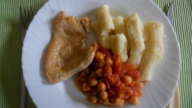 cervusDanes: puranji zrezeki, čičerika v paradižnikovi omaki, skutini svaljki, zelena solata