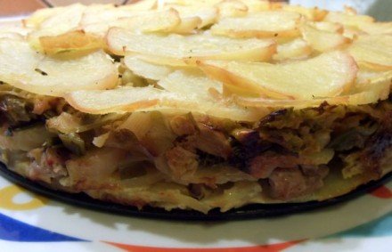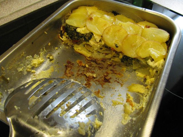 Od nekod je privlekel (Človek) en par svežih klobasic, občutno premalo za samostojno jed, zato danes krompirjeva torta (po plasteh krompir, dušen ohrovt, dušen por, olupljena, razdrobljena, s suhim paradižnikom popečena klobasica, če bi bili korajžni, bi bil še sir, pa jajca s smetano za preliv):