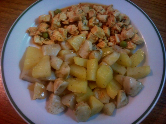 Današnje kosilo pri nas: topinambur in krompir v pečici in piščančji koščki v sladko-kisli omaki.