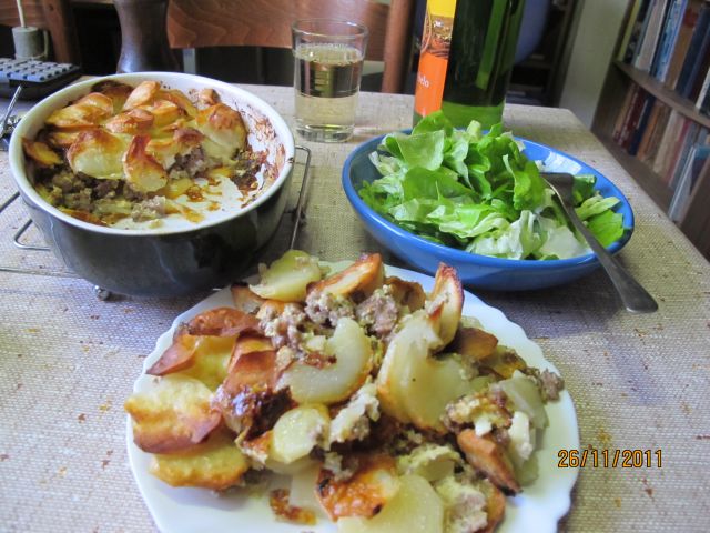 Danes pri nas: mesno krompirjev golaž, malce črnega kruha. Zdajle se peče smetanovo-